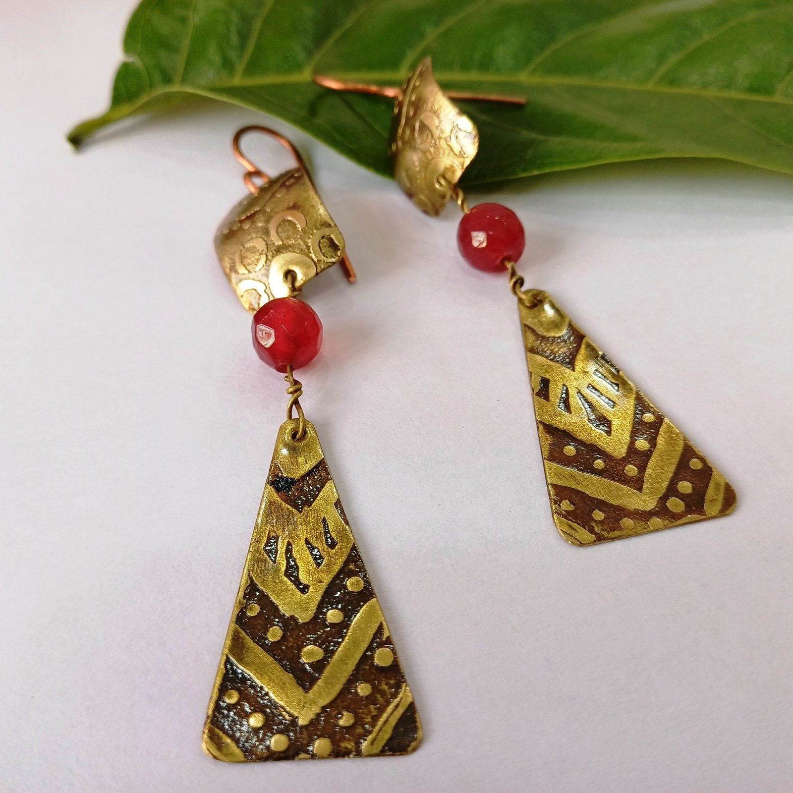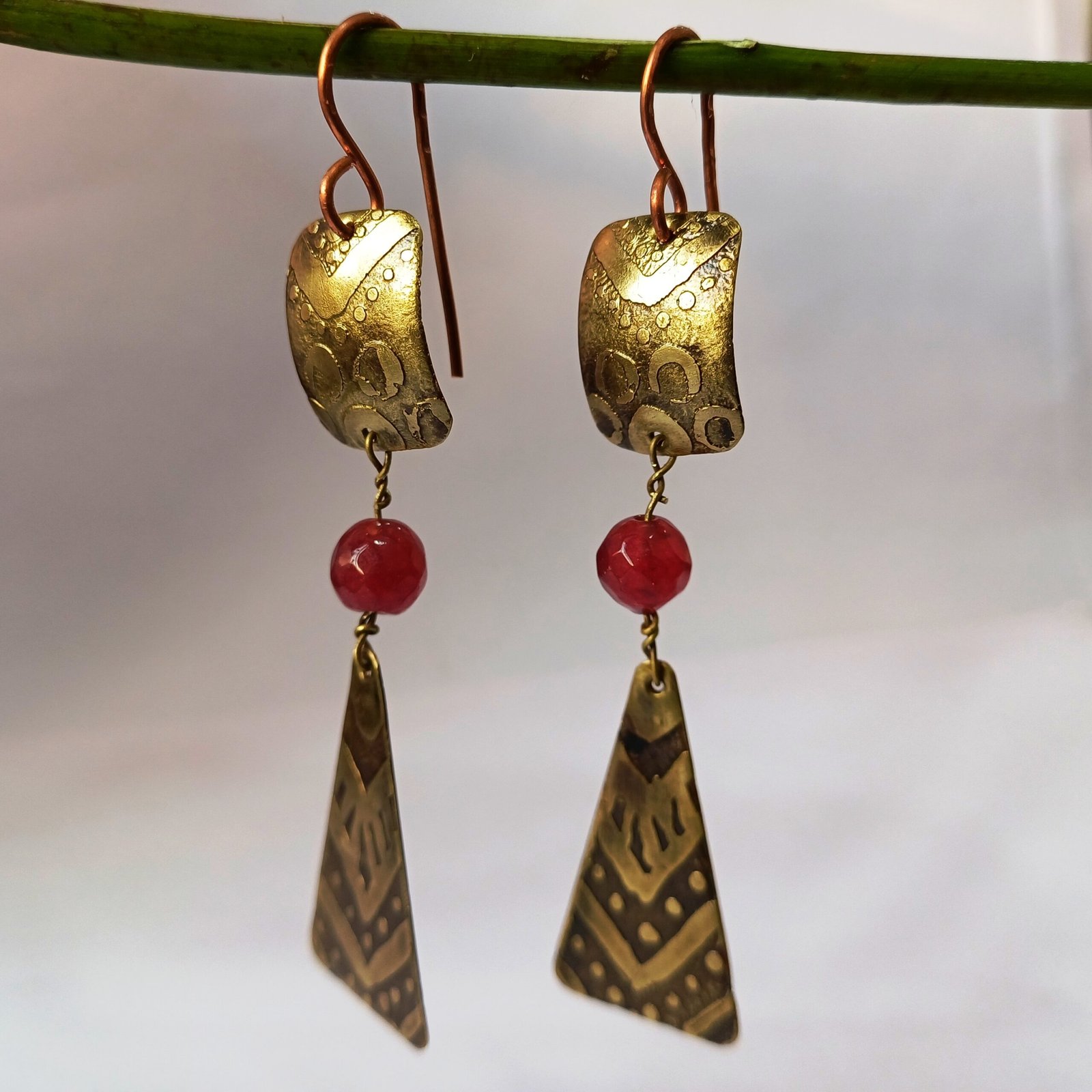 Inspired by artisanal craftsmanship, the Bohemian Sunset Brass Earrings are a stunning blend of earthy elegance and bold design. Made from high-quality brass with delicate engraved patterns, these earrings feature a gracefully curved upper piece, followed by a striking red natural stone bead, and finished with an elongated triangular pendant. The intricate details and warm brass tones create a unique, vintage aesthetic, making them a perfect accessory for both casual and formal wear.