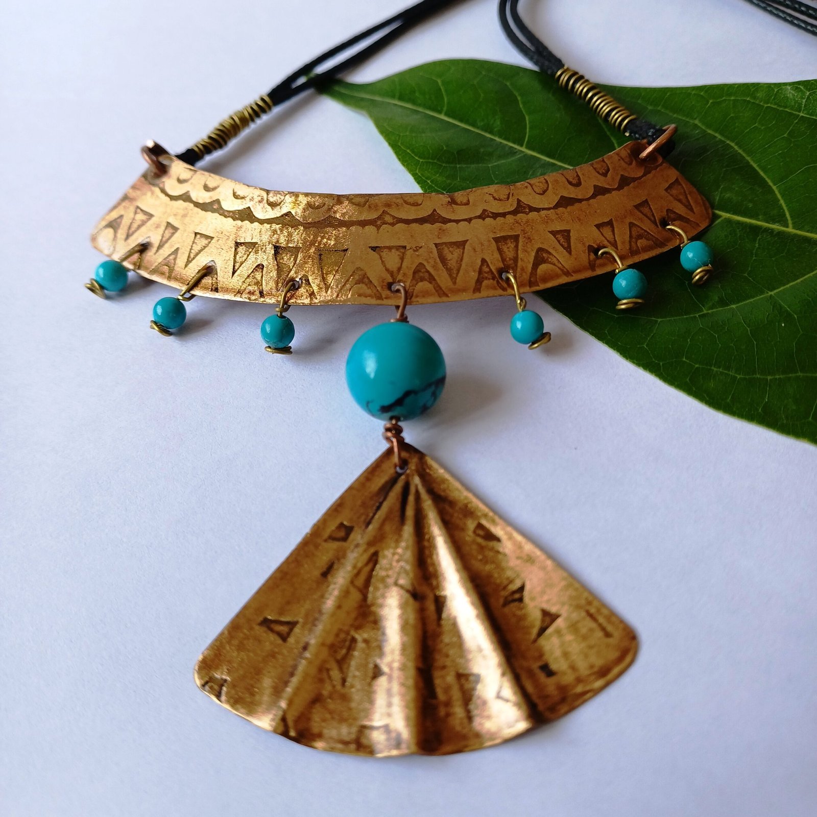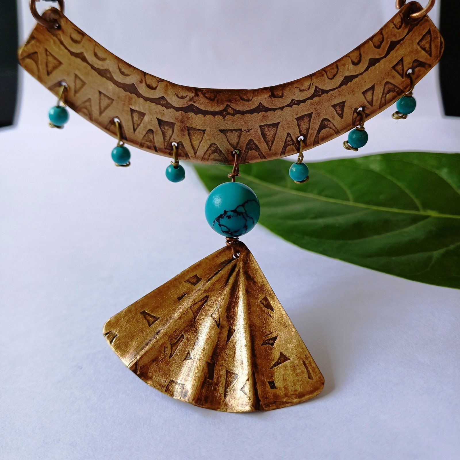 The Turquoise Majesty copper necklace is a handcrafted statement piece featuring a polished Copper  adorned with vibrant turquoise beads and a fan-shaped Copper accent. Its intricate geometric etchings and bold design make it a perfect blend of tradition and modernity, ideal for those who love Indian handicraft jewelry.