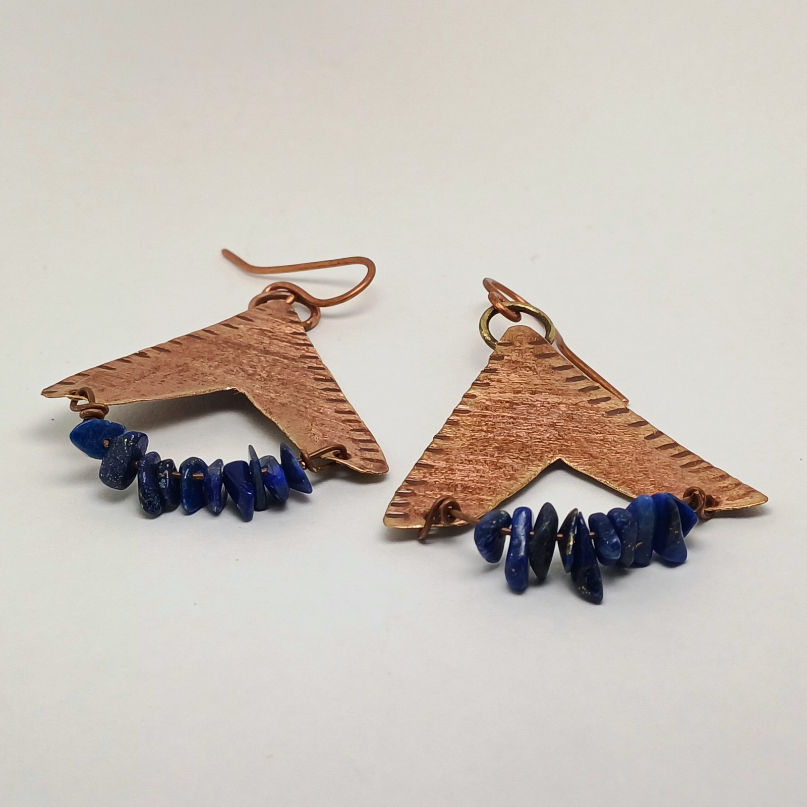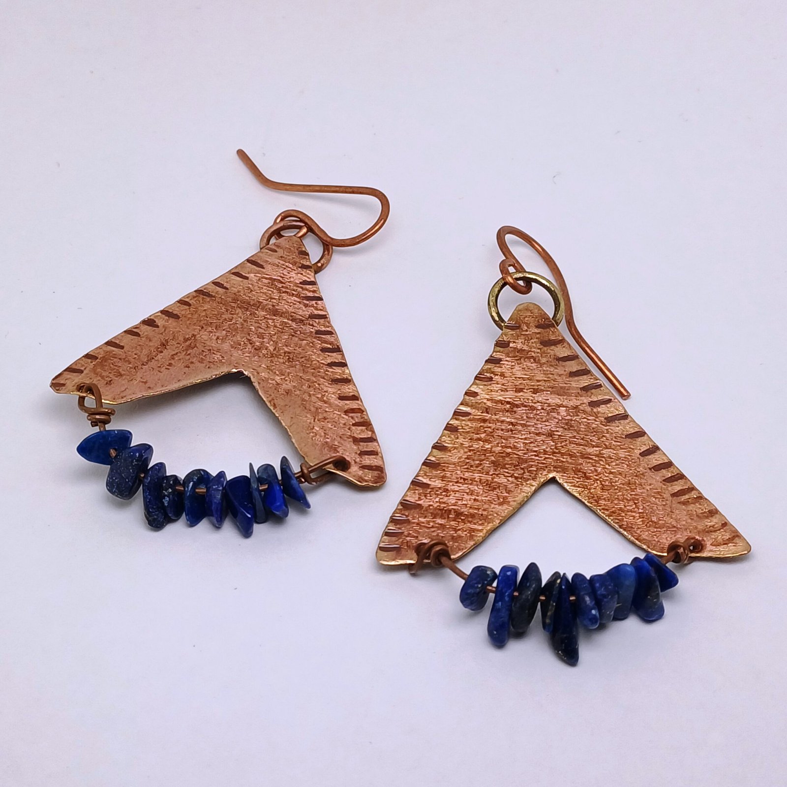 Make a bold statement with these handcrafted copper earrings, featuring a unique triangle design accented with rich blue Lapis Lazuli stone chips. Inspired by bohemian and tribal aesthetics, these earrings blend earthy elegance with a touch of modern artistry. The hand-textured copper adds depth and character, while the Lapis Lazuli stones bring a vibrant contrast, symbolizing wisdom and inner peace..