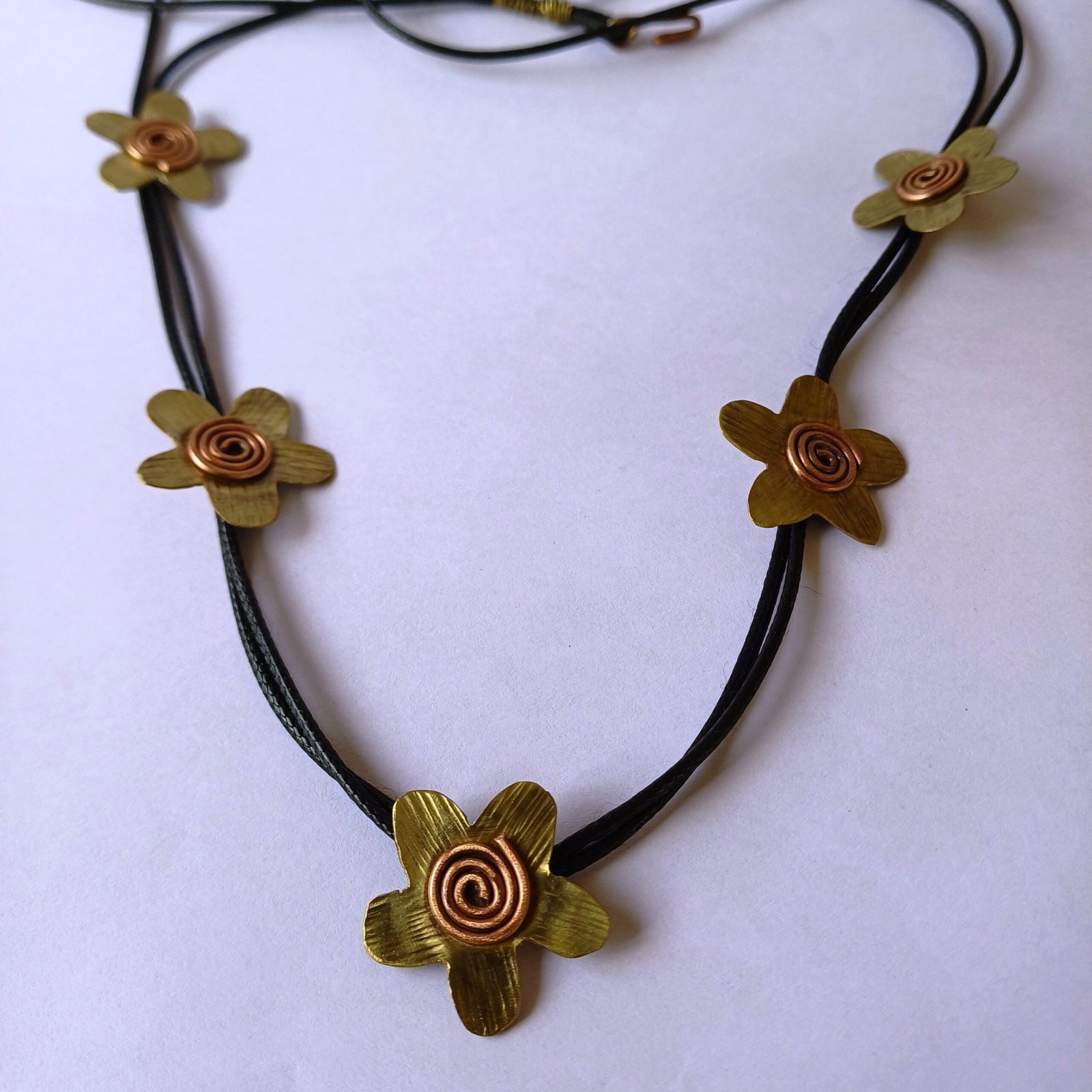 + Free ShippingHandcrafted with care by the artisans of Handian Art Craft, the Floral Whisper Brass-Copper Necklace embodies the essence of nature-inspired Indian jewelry. This lightweight necklace features five intricately designed flowers, each crafted from polished brass with a warm golden hue. At the center of each flower is a copper wire spiral, adding a contrasting reddish tone and a touch of whimsy to the design. The flowers are evenly spaced along a durable black cord, creating a minimalist yet striking look that complements both traditional and contemporary outfits.