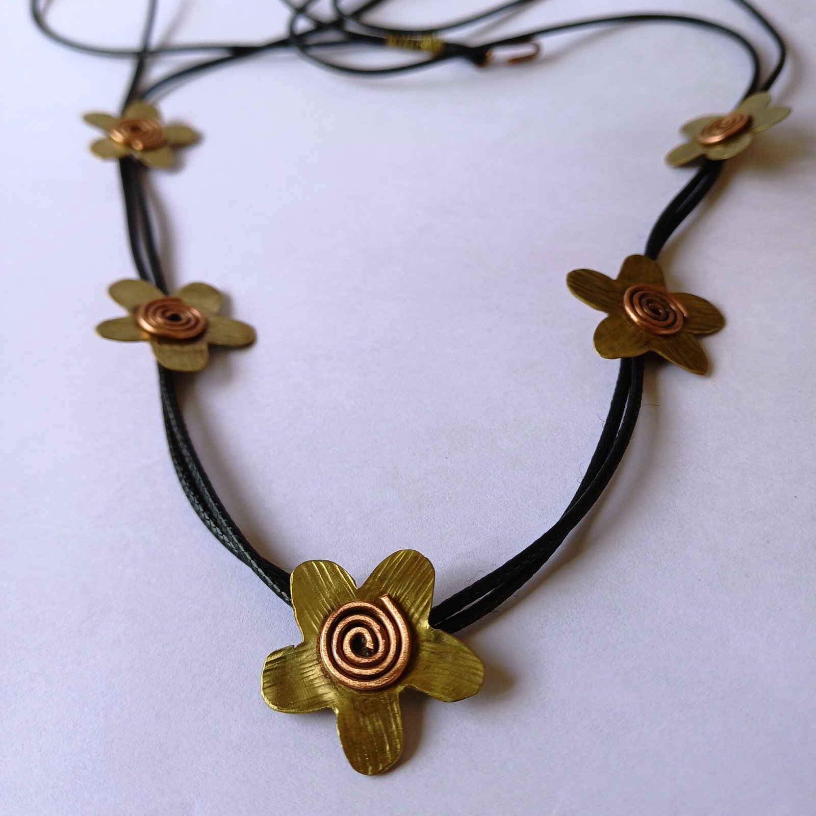 - Flower Size: Each brass flower is likely around 0.75 to 1 inch (1.9 to 2.5 cm) in diameter, with the copper spiral center being smaller, around 0.3 to 0.5 inches (0.8 to 1.3 cm).