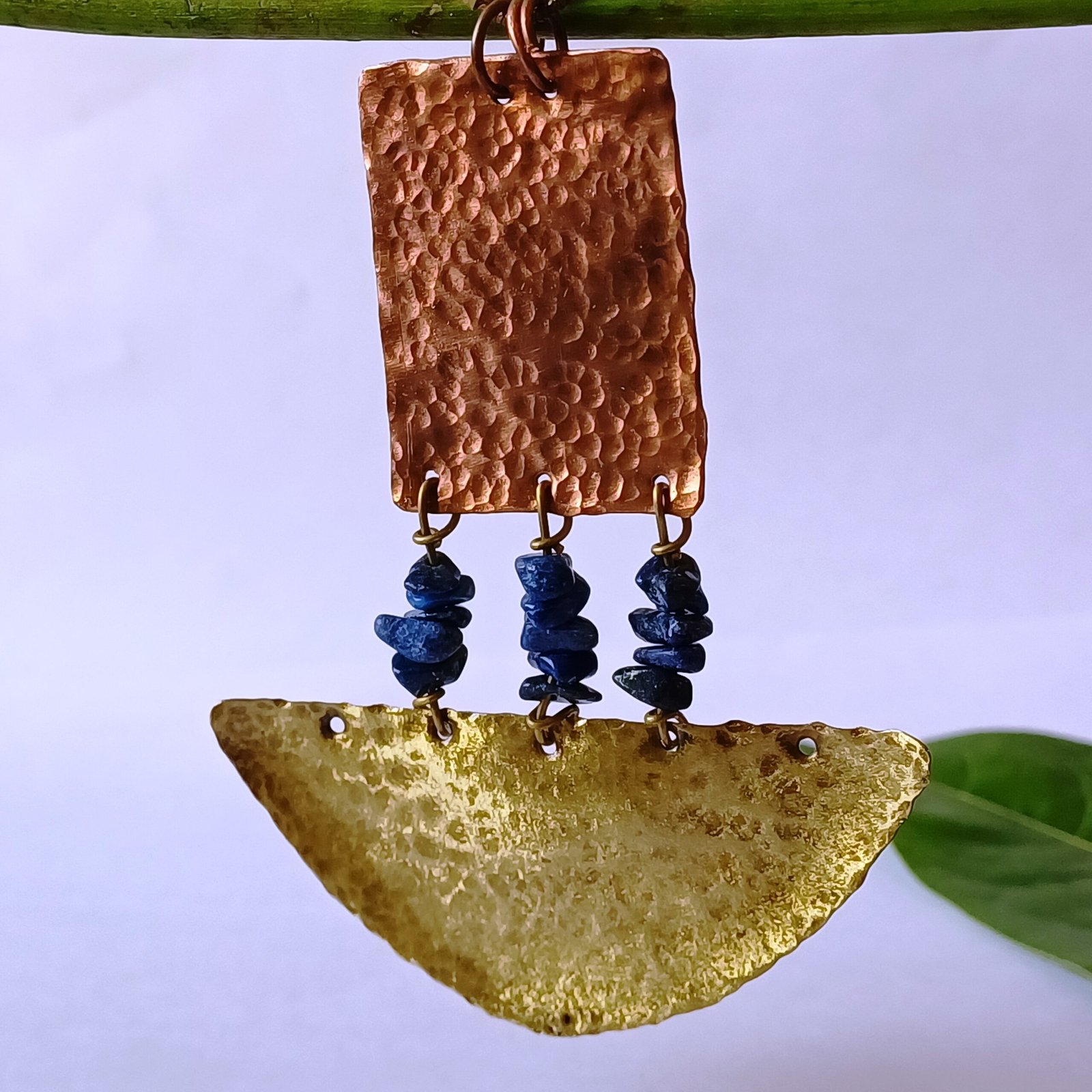 den sheen. The combination of textures and metals creates a striking contrast that highlights the craftsmanship involved. Three clusters of deep blue stones—likely sodalite or blue sapphire—dangle from the brass piece, each wrapped with copper wire, adding a vibrant pop of color and a sense of movement to the design. The pendant is strung on a durable black cord, with adjustable ends wrapped in copper wire for a secure and customizable fit. This necklace is ideal for those who appreciate the artistry of Indian handicrafts and the earthy allure of natural materials. Wear it as a statement piece for casual outings or pair it with other Handian Art Craft creations, such as our coral or turquoise-adorned jewelry, to create a layered, bohemian look. The copper and brass may develop a natural patina over time, enhancing the necklace’s vintage appeal, while the blue stones add a touch of serene elegance.
