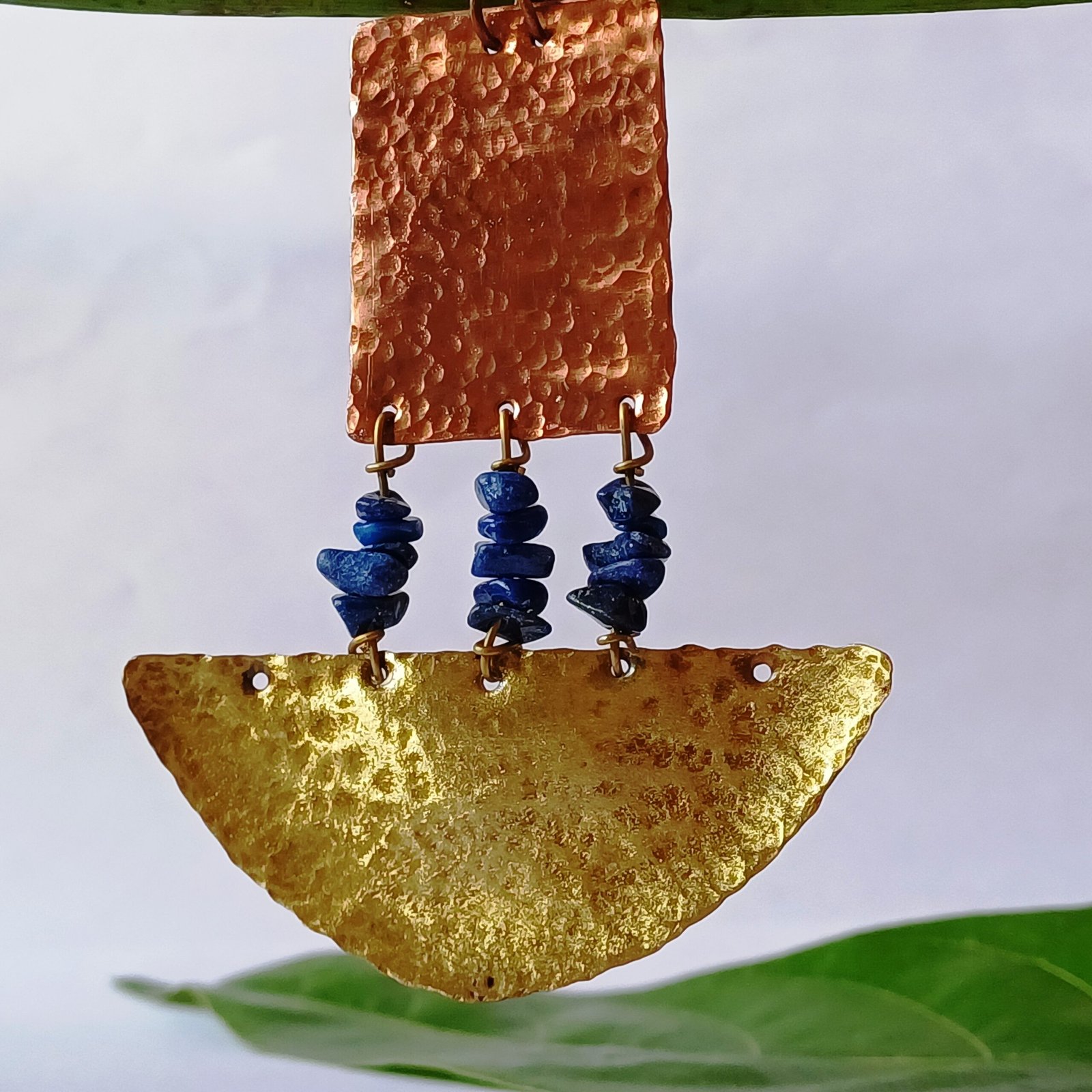 Handcrafted with precision by the artisans of Handian Art Craft, the Sapphire Echo Copper-Brass Necklace is a beautiful fusion of rustic charm and bohemian elegance. The pendant features a two-part design: a rectangular copper piece with a hammered texture, showcasing the warm, reddish tones of the metal, and a semi-circular brass piece below it, also hammered to create a complementary gol