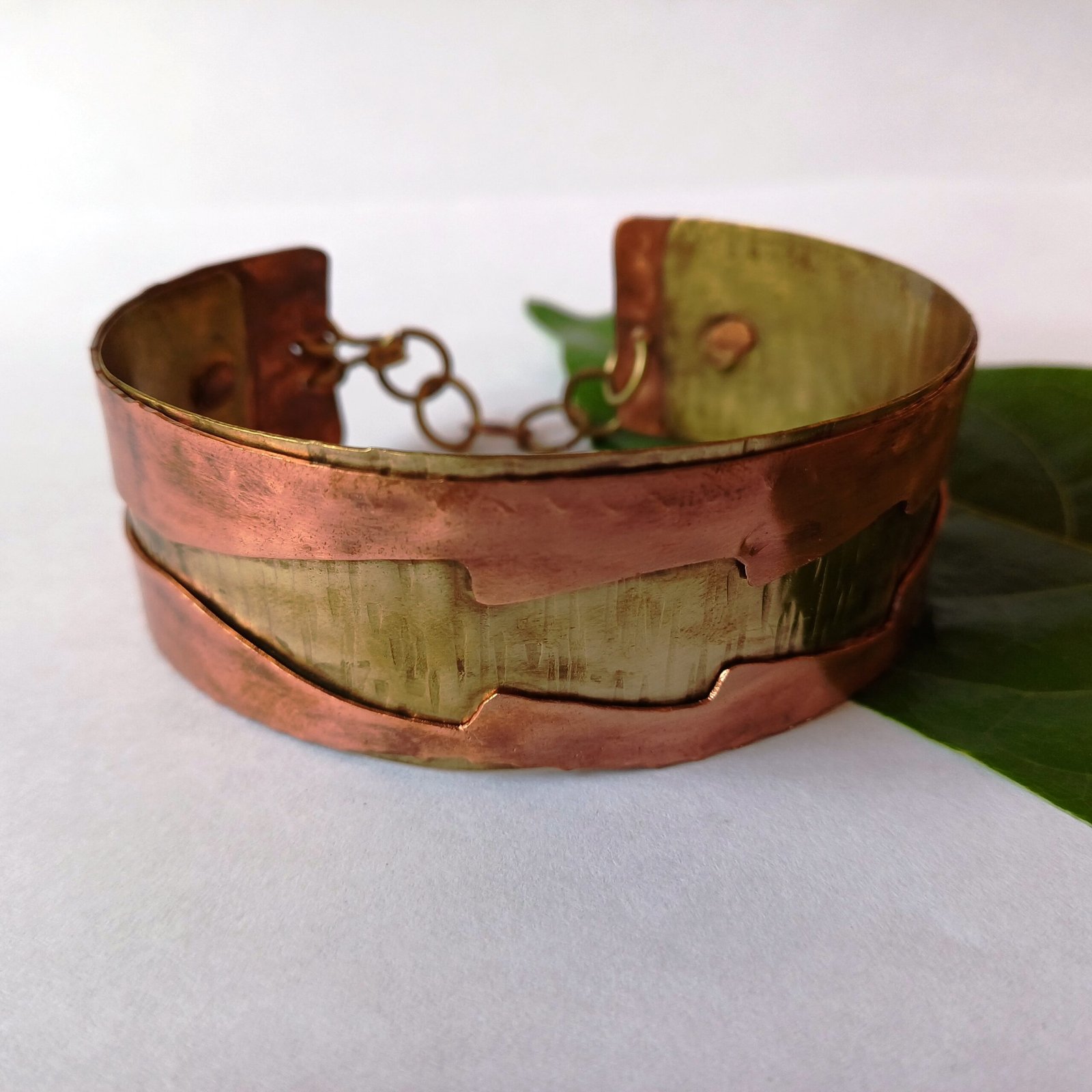 + Free ShippingExquisitely crafted by the artisans of Handian Art Craft, the Layered Elegance Copper-Brass Cuff is a stunning blend of tradition and modernity. This hand cuff features a wide copper band as its base, overlaid with a textured brass strip that creates a striking contrast of warm copper and golden brass tones. The brass layer is intricately etched, adding depth and character to the design, while the edges of the copper are subtly distressed for a rustic, vintage appeal. A delicate copper chain detail adorns one end, adding a touch of femininity and movement to the piece.