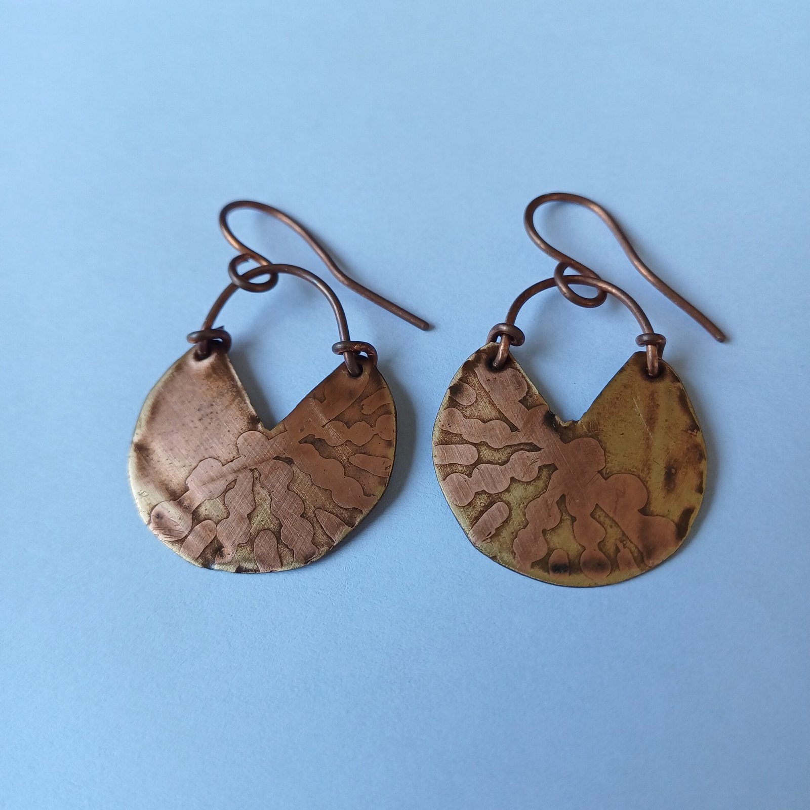 The Earthly Imprint Earrings blend artistry and nature-inspired design into a stunning statement piece. These earrings are crafted from hand-textured copper with organic, freeform patterns imprinted on the surface, giving them a one-of-a-kind, rustic appeal. The crescent-shaped brass backing adds depth and contrast, making these earrings a perfect accessory for bohemian, earthy, or vintage-inspired looks.