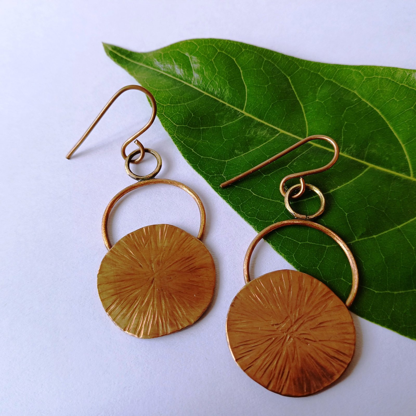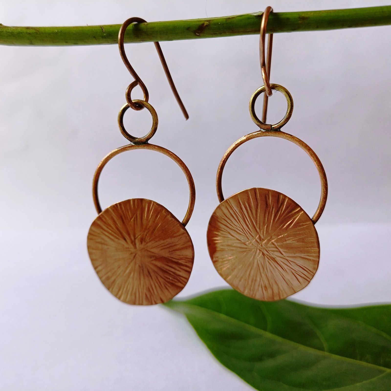 Inspired by the warmth and radiance of the rising sun, these handcrafted copper earrings feature a beautifully textured disc with a delicate sunburst pattern, hanging gracefully from rustic brass hoops. The combination of raw copper and brass gives these earrings a unique vintage charm, perfect for lovers of artisanal jewelry.