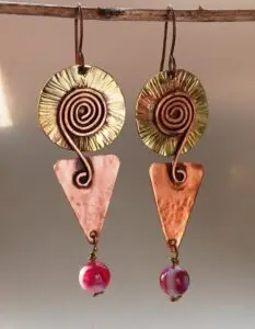 Handcrafted earrings designed with precision and artistry, featuring unique copper, silver, and brass elements. Each pair is one-of-a-kind, blending timeless elegance with sustainable fashion. Perfect for those who appreciate exclusive, artisanal jewelry.